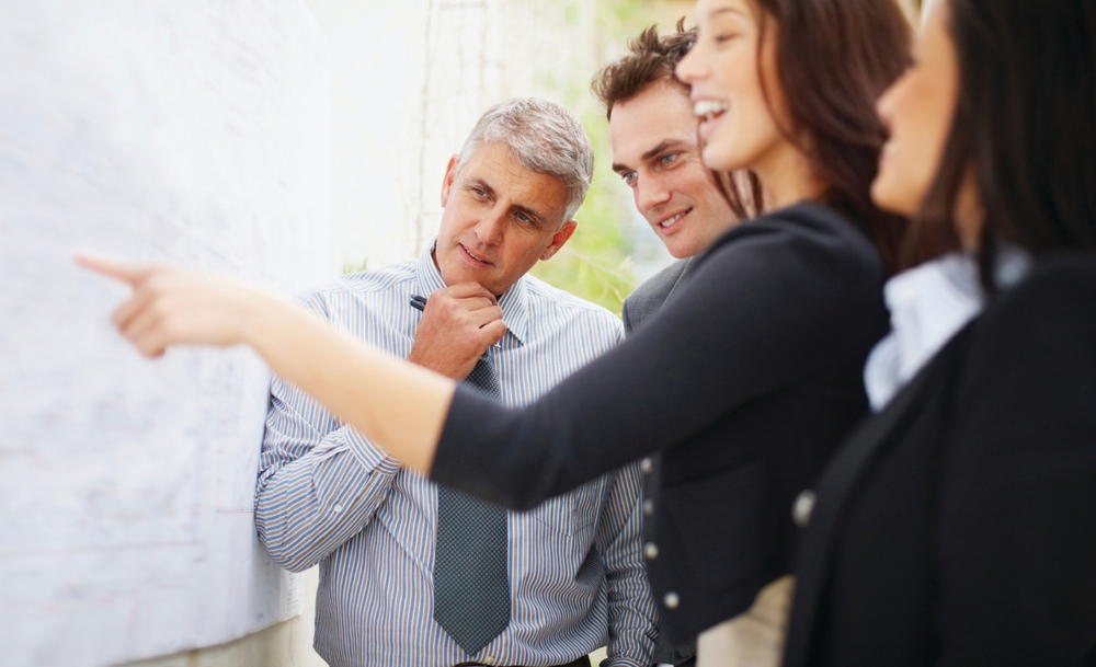 Senior manager listening to female executive pointing at white board